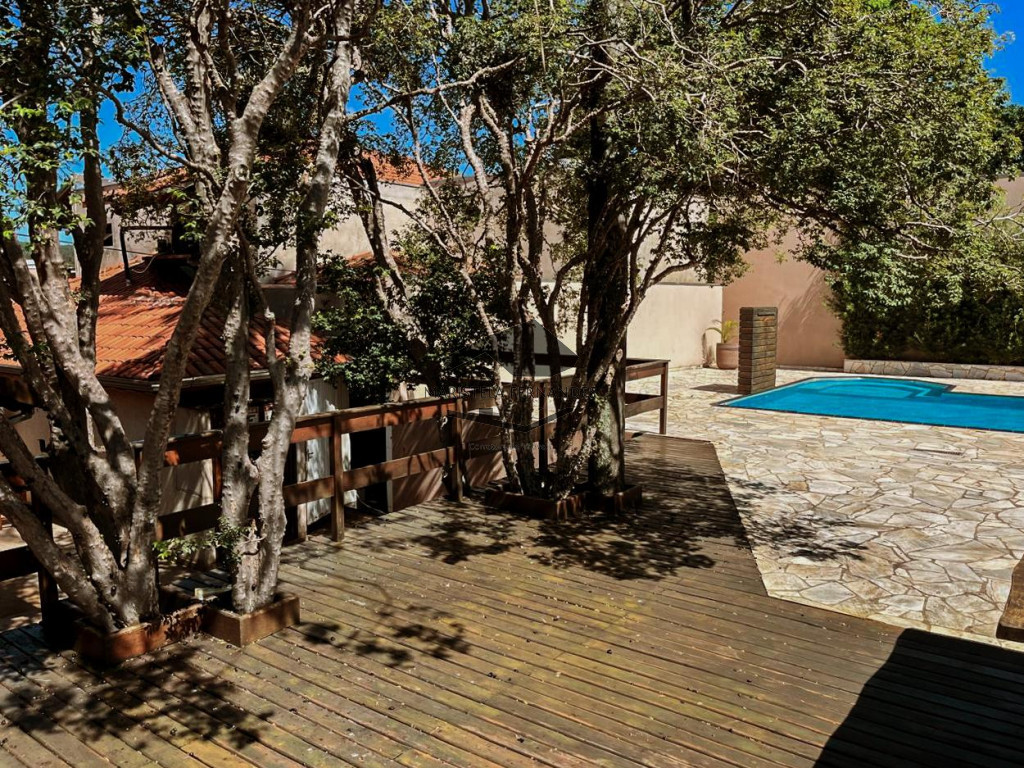 Deck de madeira superior com 8 jogos de mesas de madeira com 4 cadeiras,